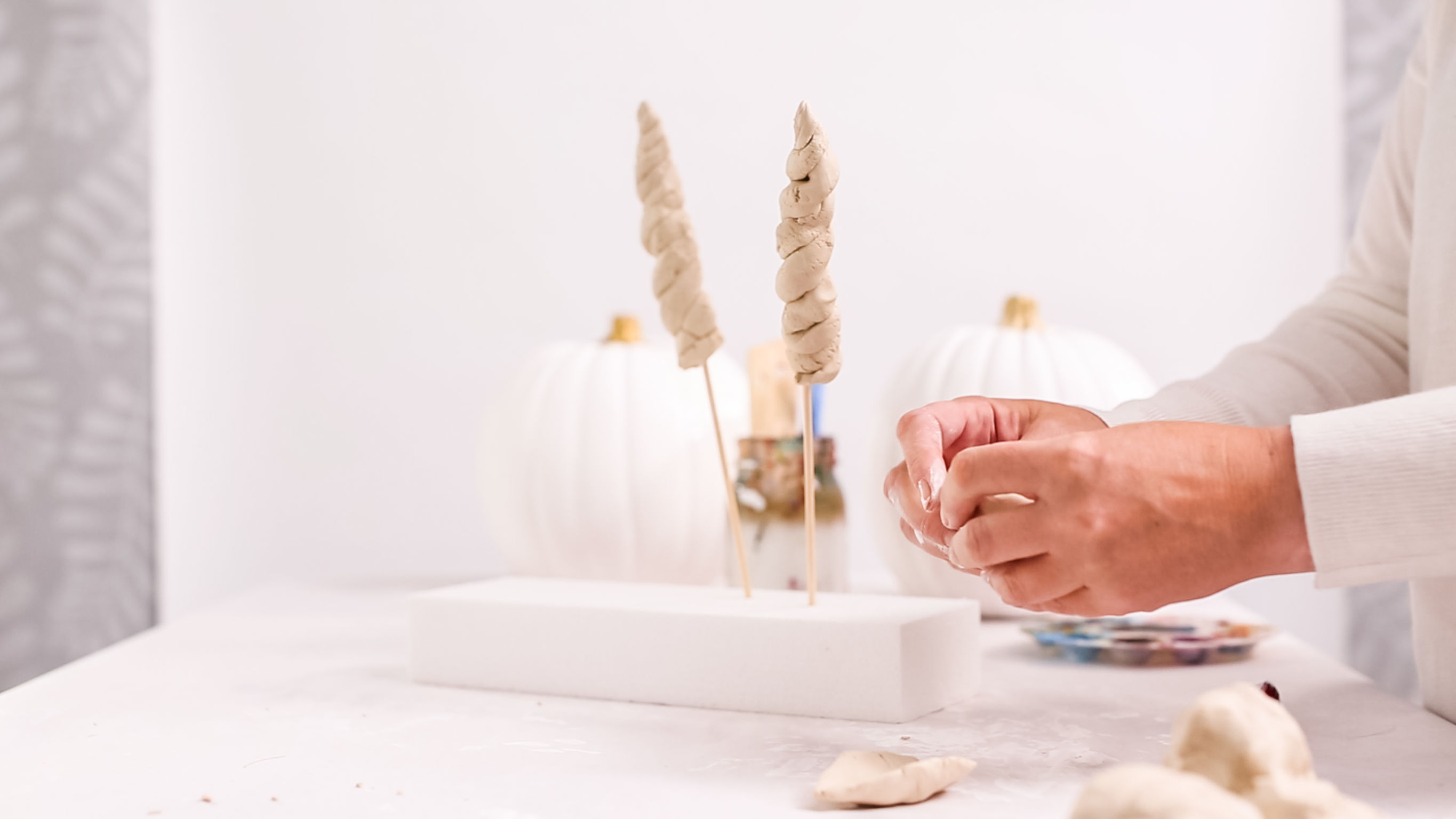 Formázzunk gyurmából formázzunk méretarányos füleket és szarvat – fessük le metáleffekt festékkel, és rögzítsük őket hurkapálcával.