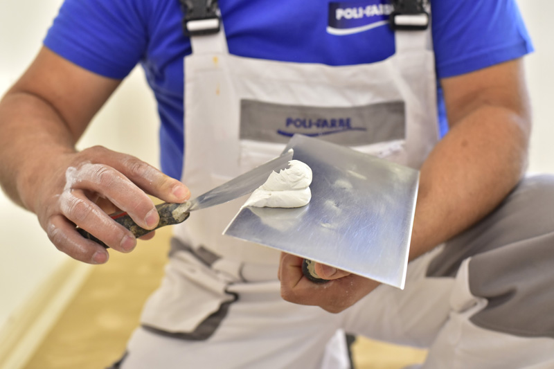 Kisebb sérülések javítására választhatjuk például a Poli-Farbe kész glettet is, amely keverés nélkül, egyenesen a dobozból is felhasználható. Egy kisebb spaklival közvetlenül a dobozból vehetjük ki a glettet, és már hordhatjuk is fel egy vagy két egyenletes rétegben a falfelületre.